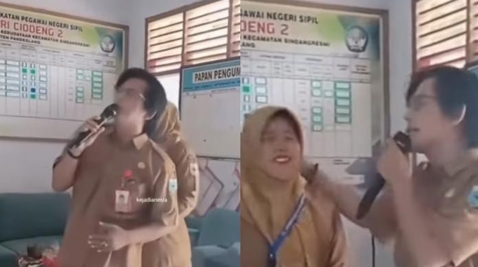 Dalam video yang beredar, keduanya tampak menyanyi bersama menggunakan smart TV bantuan pemerintah di ruang guru, sambil berpegangan tangan dan sesekali berpelukan.